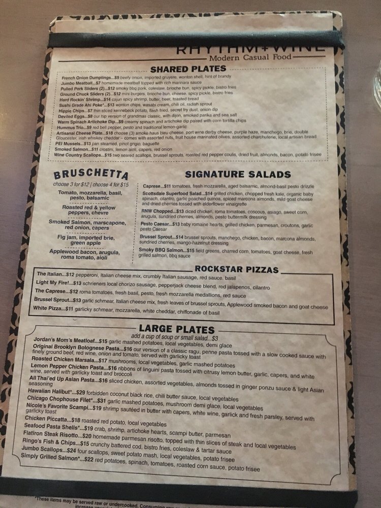 "Rhythm and Wine" is a New American restaurant in Scottsdale, AZ that offers a unique dining experience. Known for its extensive menu of appetizers, including their House Signature French Onion "Dumplings", this restaurant provides a cozy setting with outdoor seating and live music on Friday nights. The entrees like Roasted Chicken and Asian Braised Short Ribs are a highlight, showcasing the chef's culinary skills. Customers praise the warm atmosphere, excellent service, and delicious food, making "Rhythm and Wine" a go-to spot for a memorable dining experience.
